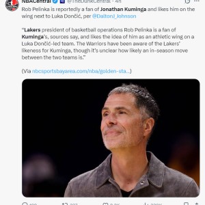北京时间1月16日,根据《洛杉矶时报》记者Dalton Johnson的报道,湖人GM罗勃-佩林卡是库明加的粉丝,他希望...