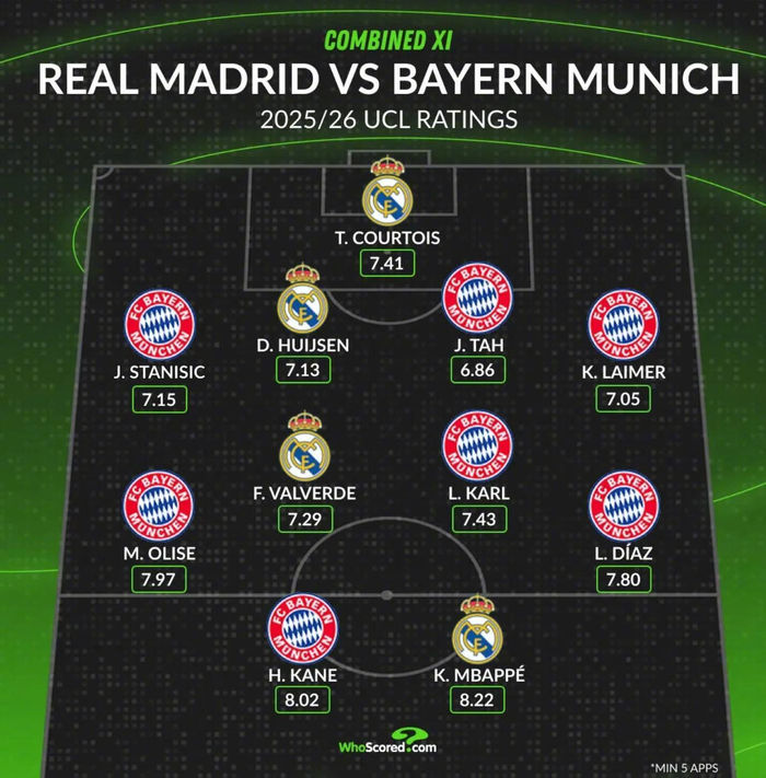Whoscored根据球员在本赛季欧冠联赛中的评分,排列出了拜仁慕尼黑、皇家马德里的合体最佳阵容。